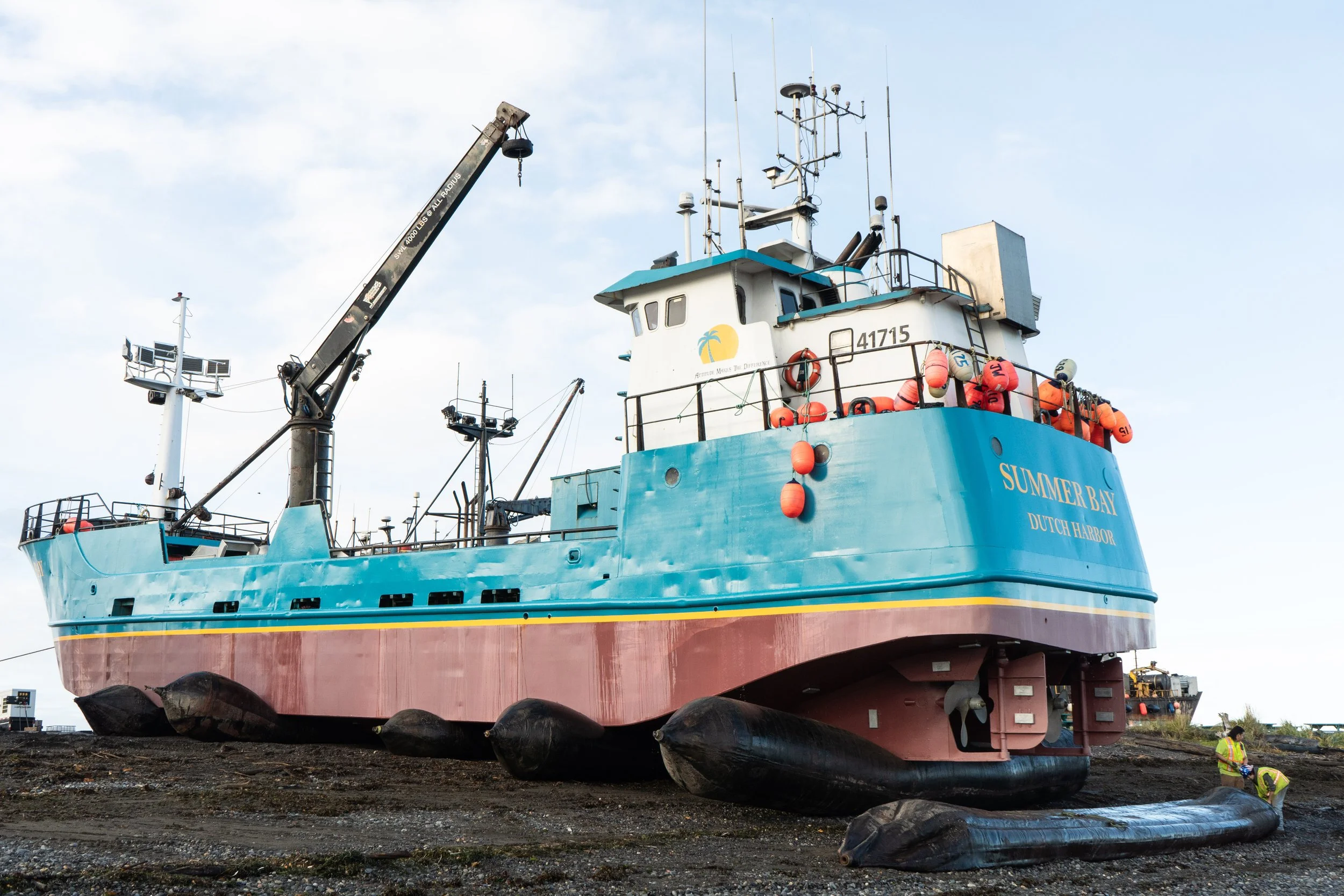• We offer large vessel haul-outs from September to May on the Homer Spit (next to the Pier One Theatre). Using specialized airbags, we carefully roll your vessel out of the water and onto the beach, where it’s securely stabilized with cribbing. After the project is finished, we use the same process in reverse to guide your vessel back into the water. We are well practiced at handling each vessel with safety and care as well as adapting to large tides and unruly weather.
